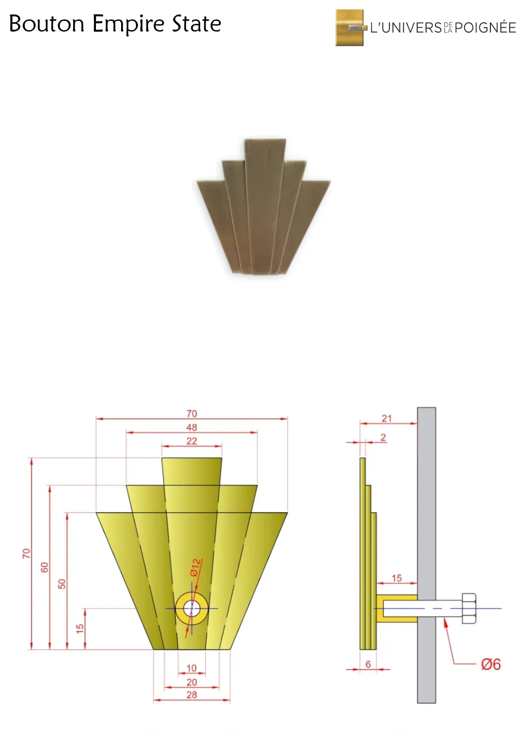 Évoquant l'élégance et la grandeur du mouvement Art Déco, le bouton Empire State 70mm est un bouton de meuble sculptural au design intemporel. Sa forme symétrique, décorée de palmes stylisées, rappelle les lignes classiques de cette époque où le luxe et la géométrie se mêlaient avec raffinement.
