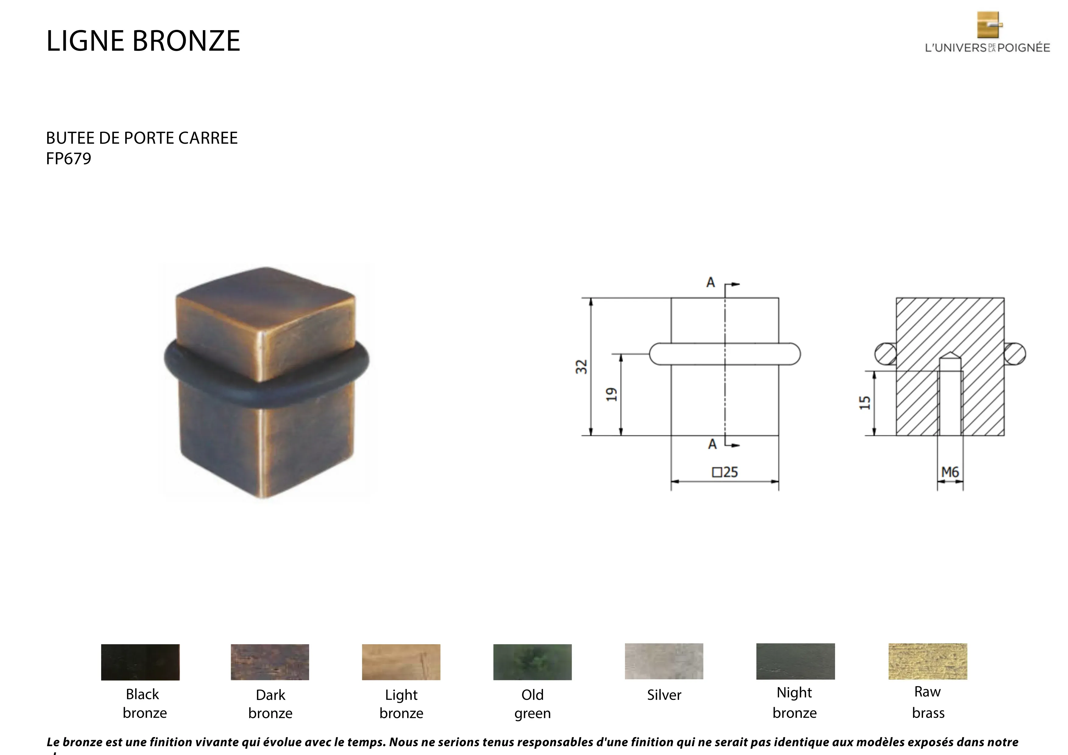 Parce que le bronze est un matériau vivant, le butoir bronze est proposé avec des patines spécialement développées, qui lui permettent d’acquérir une patine naturelle au fil du temps et de s’embellir avec l’usage. Le butoir peut également être décliné avec les finitions du laiton, bien que des variations naturelles puissent apparaître par rapport aux collections en laiton classique.