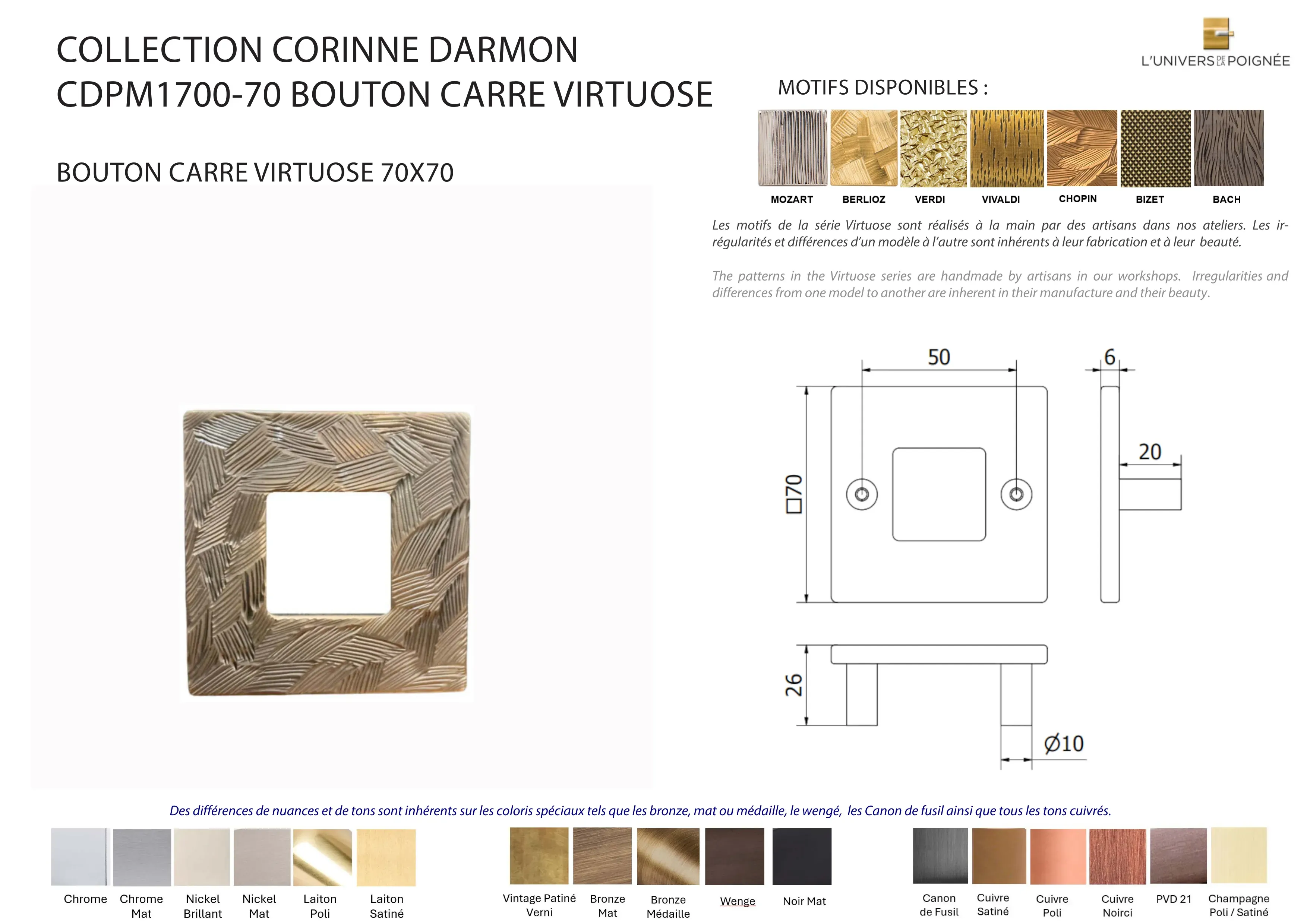 Laiton satiné ; Laiton poli ; Chrome mat ; Chrome brillant ; Nickel mat ; Nickel brillant ; Bronze mat ; Bronze médaille ; Bronze vintage ; Wengé ; Blanc ; Noir mat ; Canon de fusil ; Cuivre satiné ; Cuivre brillant ; Cuivre noirci ; Champagne mat ; Champagne brillant