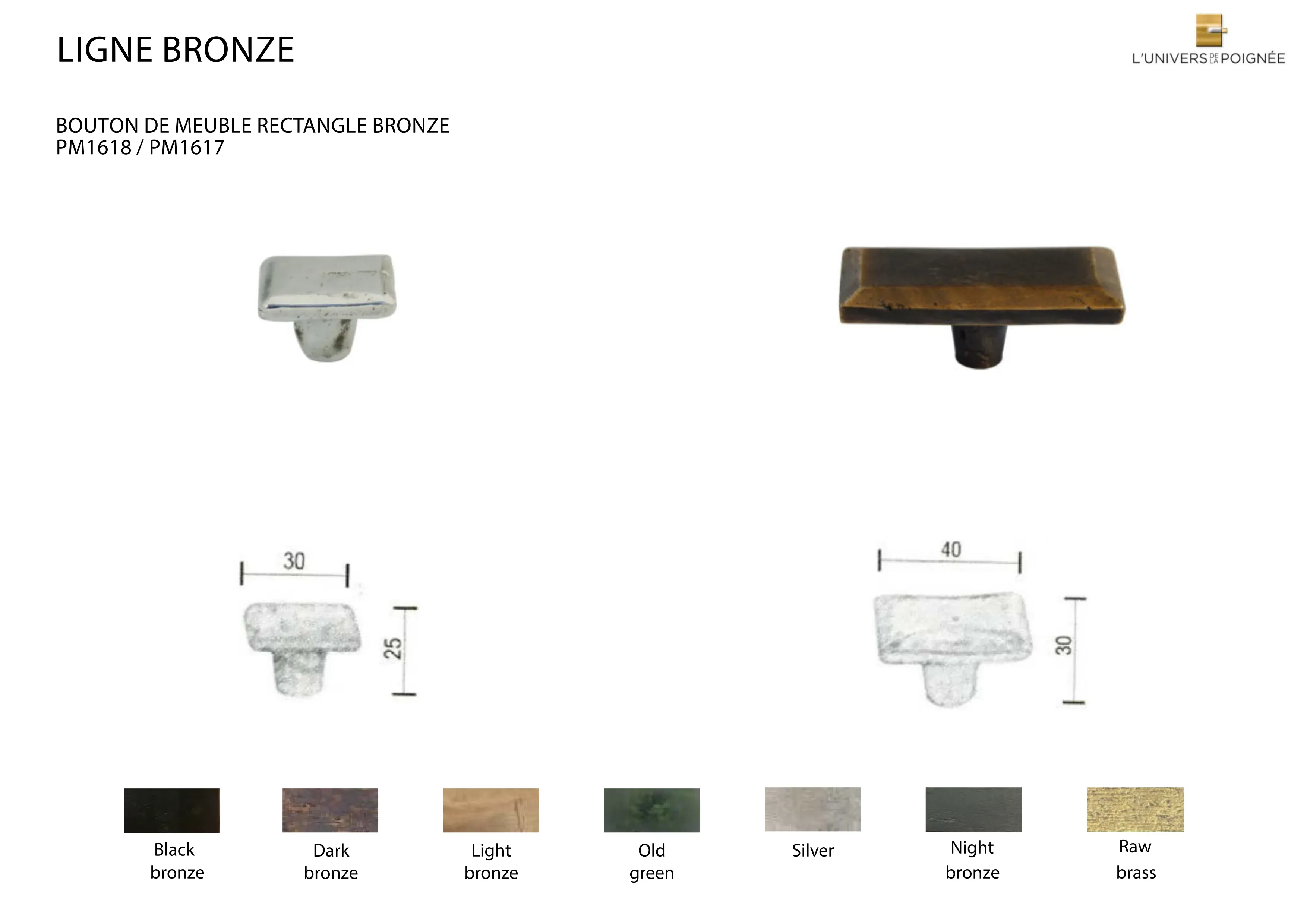 Ce bouton de meuble rectangulaire en bronze, disponible en deux tailles (30x25 mm et 40x30 mm), est conçu selon la technique traditionnelle de la fonte au sable, lui conférant un caractère unique et artisanal.