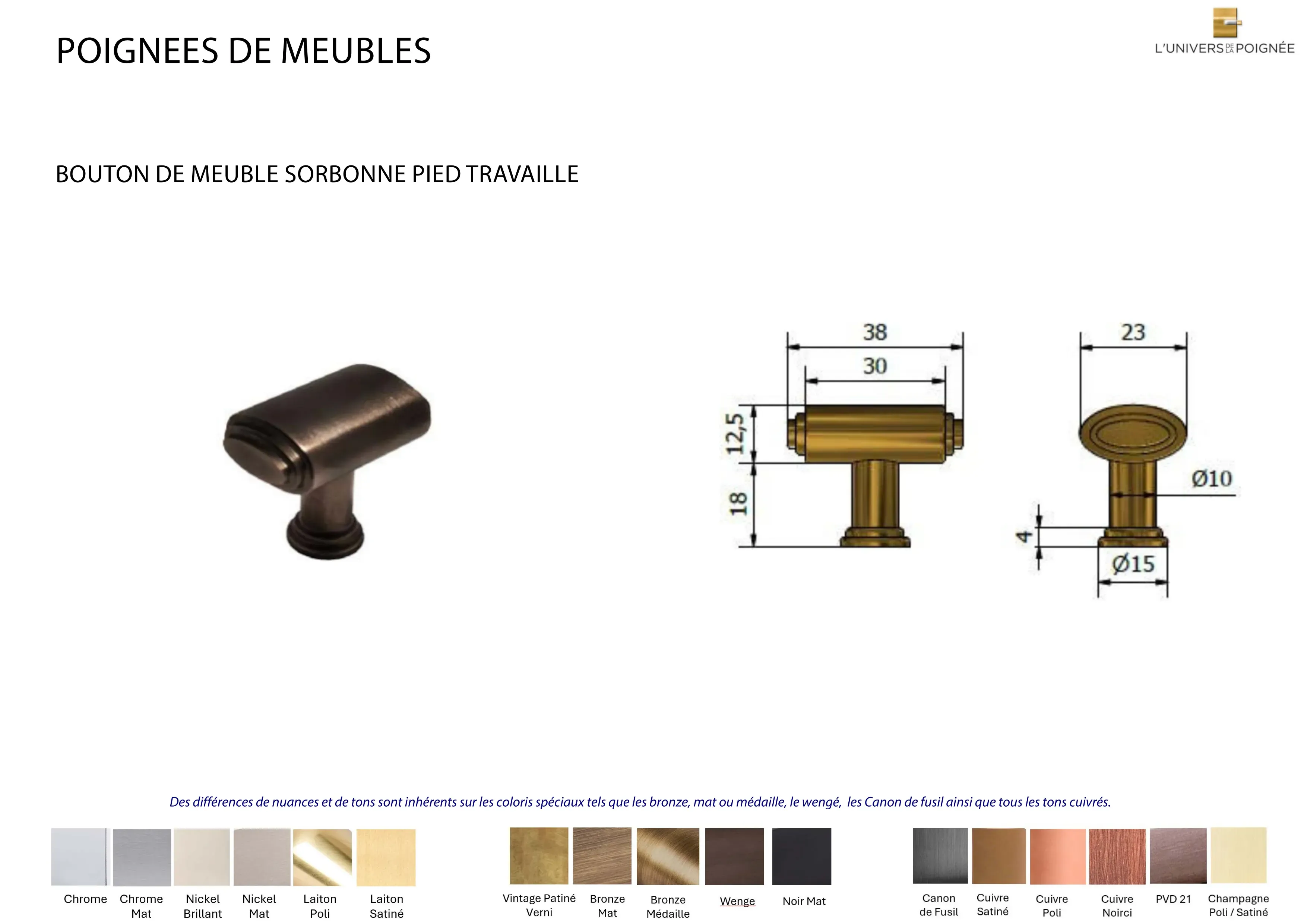 Parce que chaque intérieur mérite une finition sur mesure, le bouton est disponible en plus de 15 coloris différents, parmi lesquels : Laiton satiné ; Laiton poli ; Chrome mat ; Chrome brillant ; Nickel mat ; Nickel brillant ; Bronze mat ; Bronze médaille ; Bronze vintage ; Wengé ; Blanc ; Noir mat ; Canon de fusil ; Cuivre satiné ; Cuivre brillant ; Cuivre noirci ; Champagne mat ; Champagne brillant