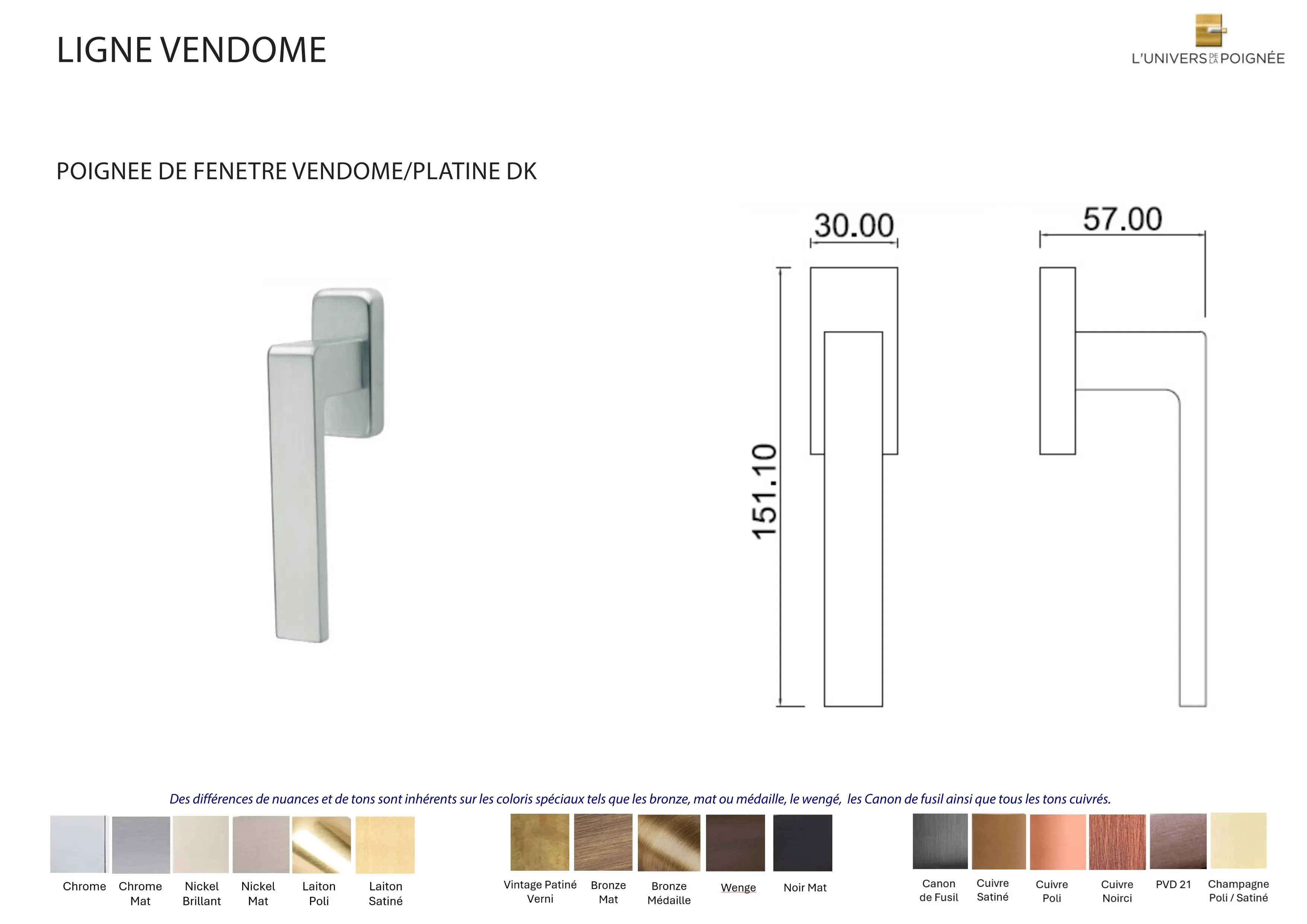 Des différences de nuances et de tons sont inhérents sur les coloris spéciaux tels que les bronze, mat ou médaille, le Wengé, les Canon de fusil ainsi que tous les tons cuivrés.