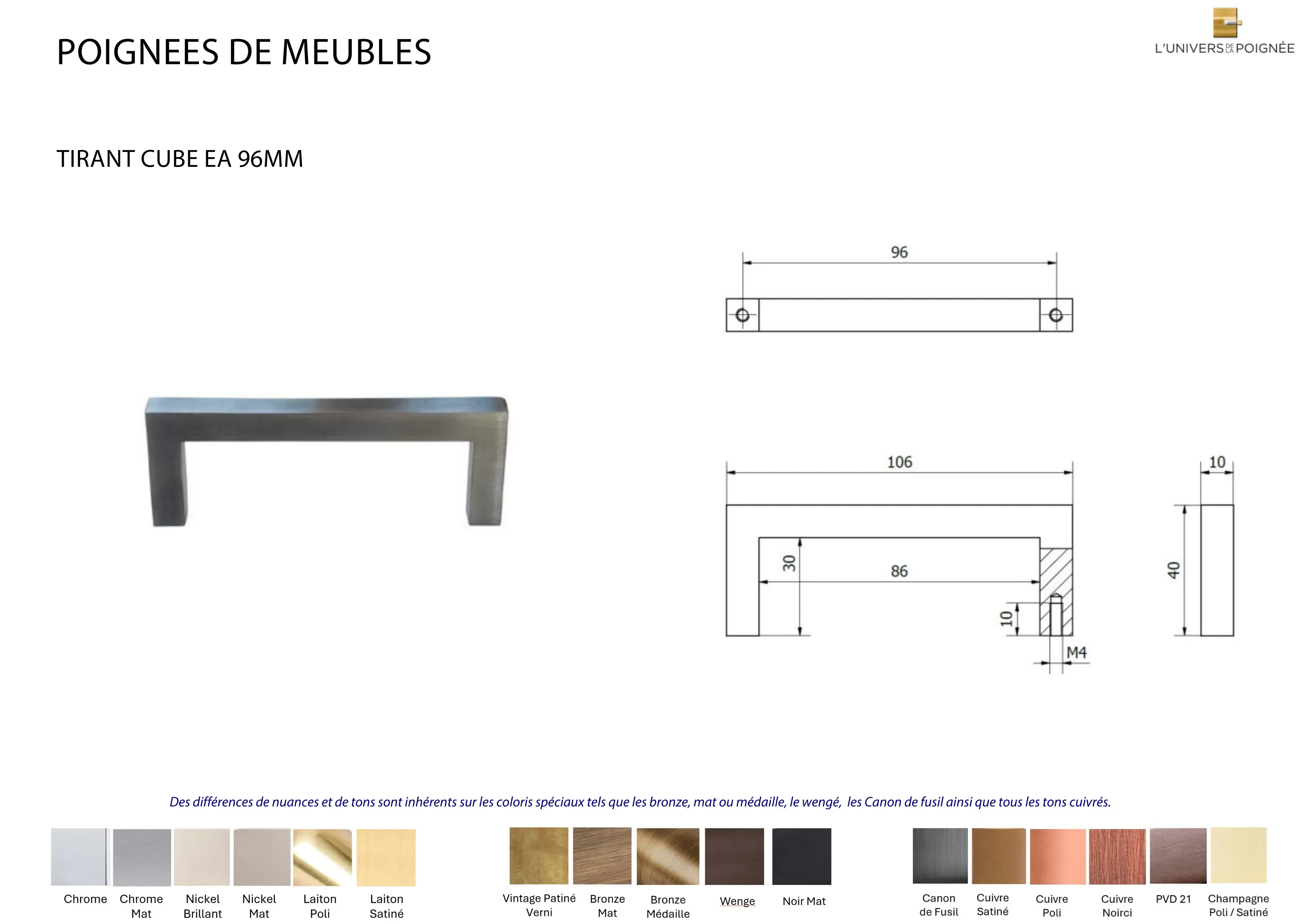 Des différences de nuances et de tons sont inhérents sur les coloris spéciaux tels que les bronze, mat ou médaille, le Wengé, les Canon de fusil ainsi que tous les tons cuivrés.