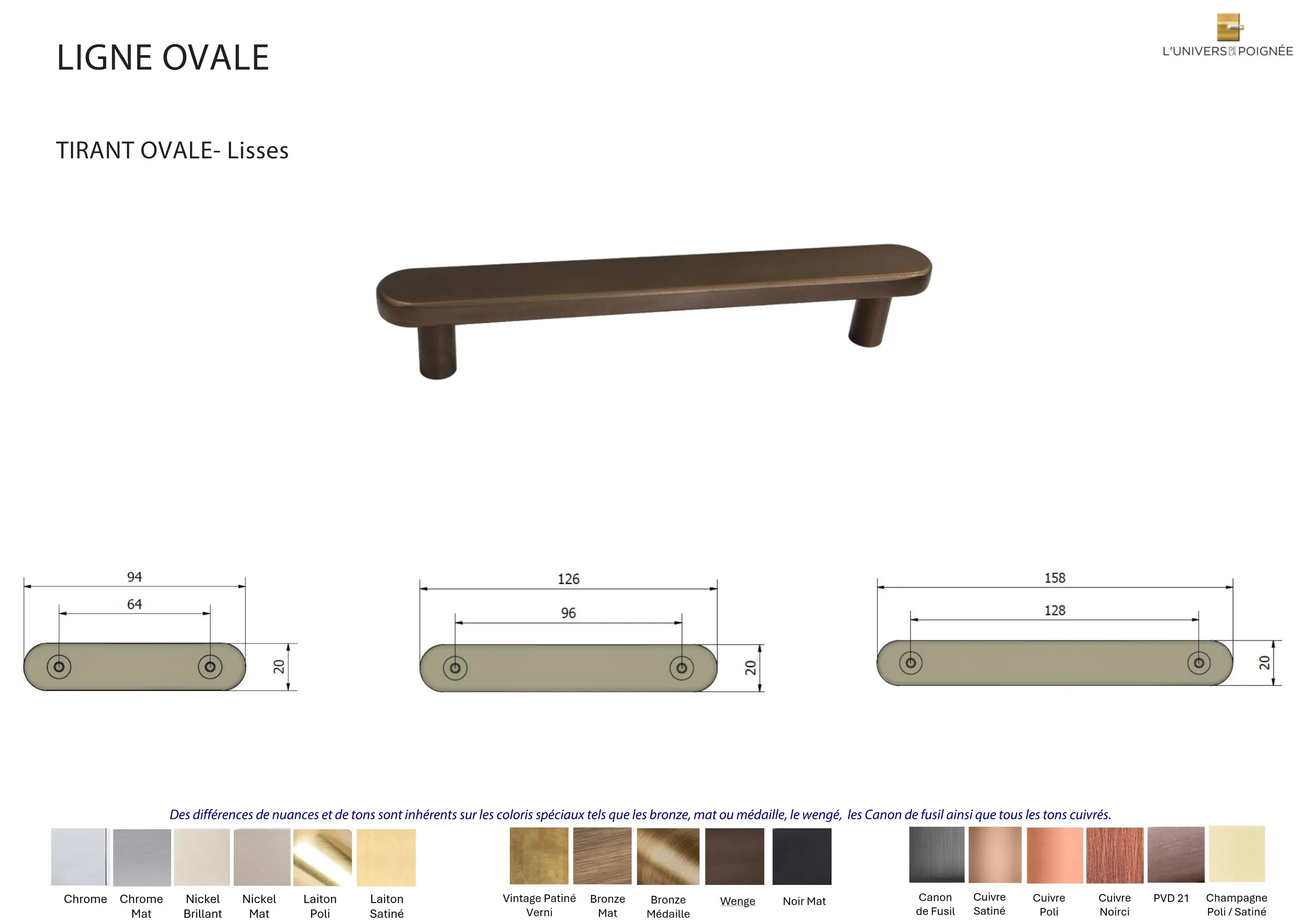 Parce que chaque intérieur mérite une finition sur mesure, le tirant est disponible en plus de 15 coloris différents, parmi lesquels : Laiton satiné ; Laiton poli ; Chrome mat ; Chrome brillant ; Nickel mat ; Nickel brillant ; Bronze mat ; Bronze médaille ; Bronze vintage ; Wengé ; Blanc ; Noir mat ; Canon de fusil ; Cuivre satiné ; Cuivre brillant ; Cuivre noirci ; Champagne mat ; Champagne brillant