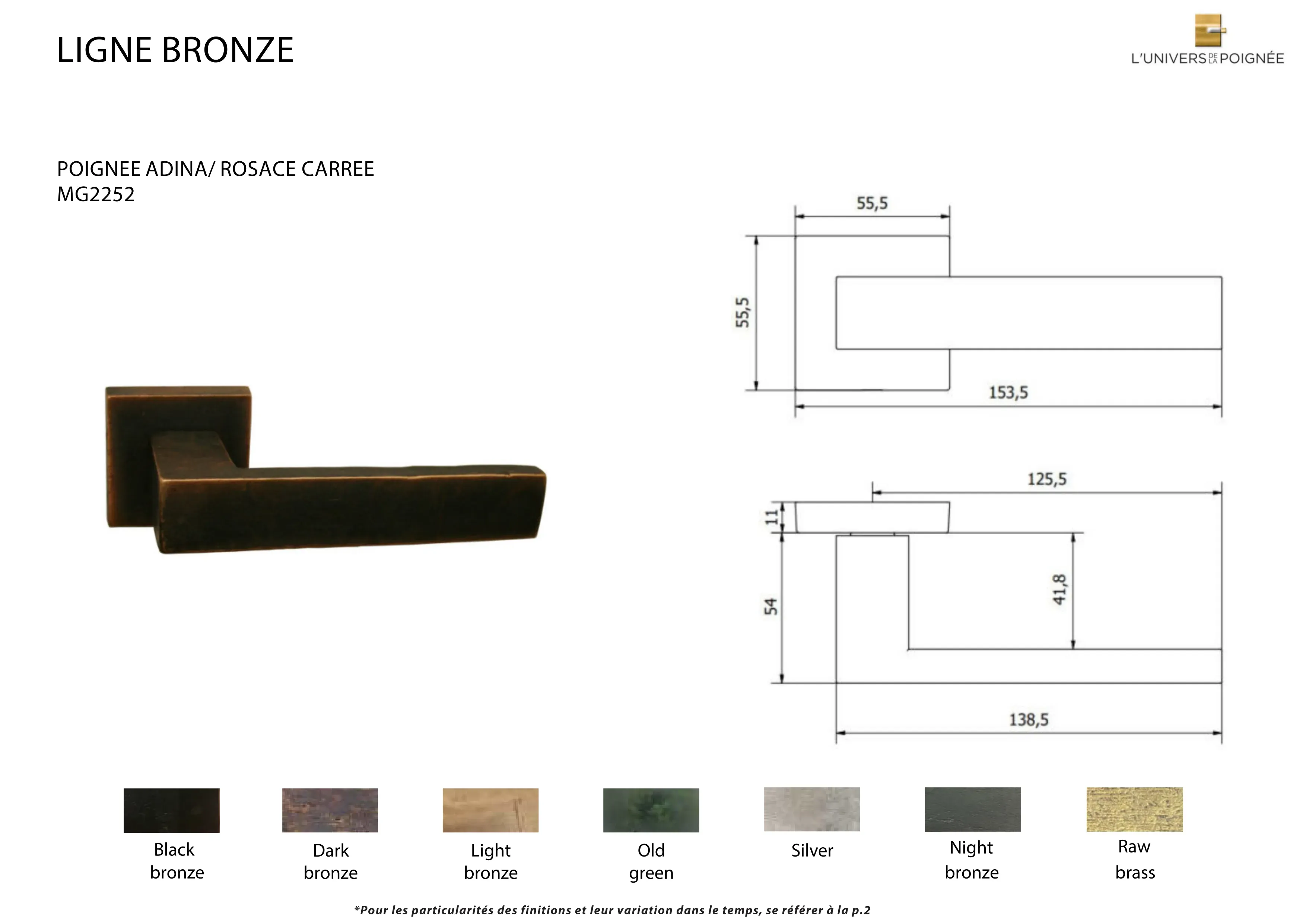 Les finitions disponibles incluent : Black bronze ; Dark Bronze ; Light Bronze ; Old Green ; Silver ; Night Bronze ; Old Brass ; Nickel Brillant