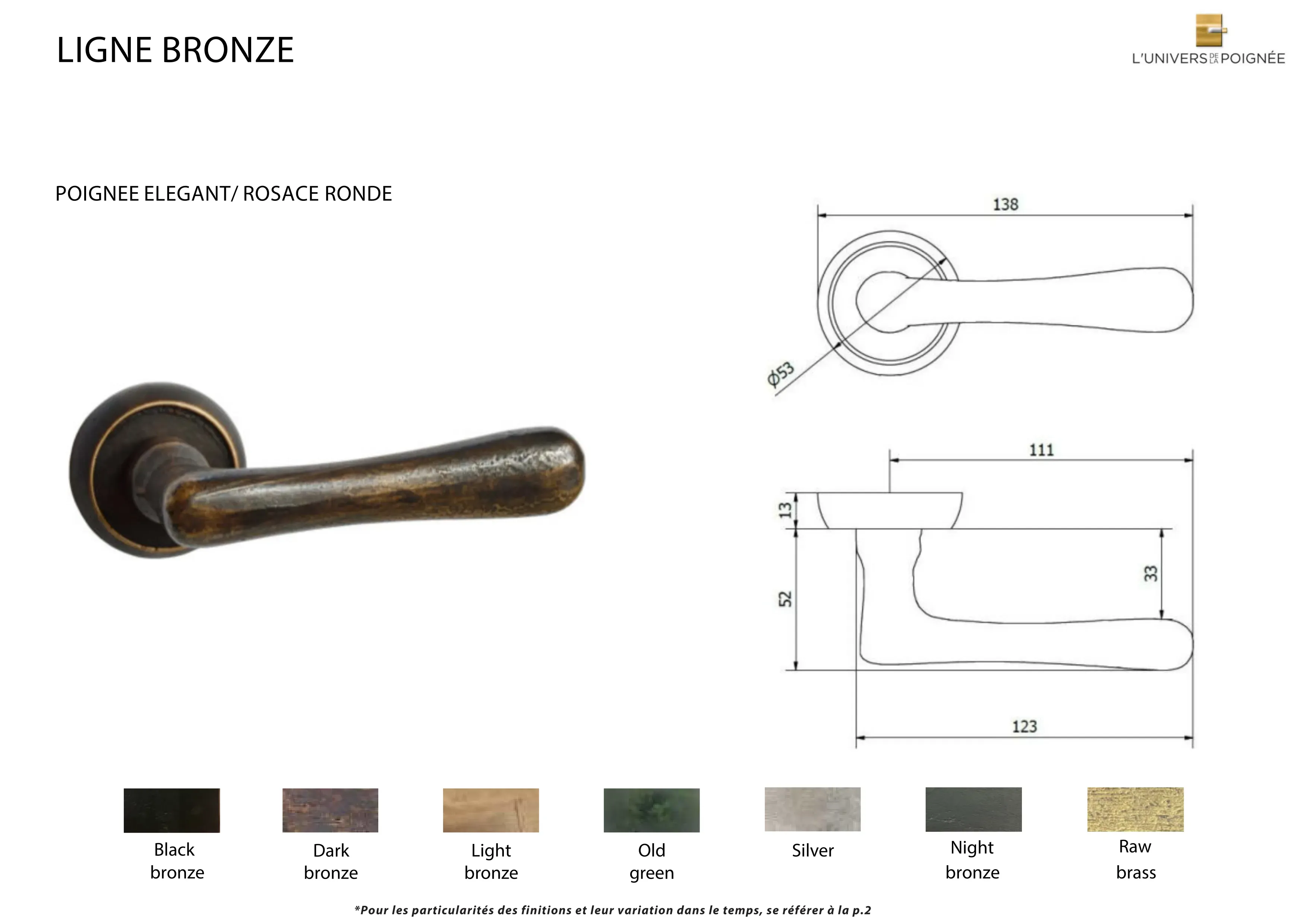 Les finitions disponibles incluent : Black bronze ; Dark Bronze ; Light Bronze ; Old Green ; Silver ; Night Bronze ; Old Brass ; Nickel Brillant