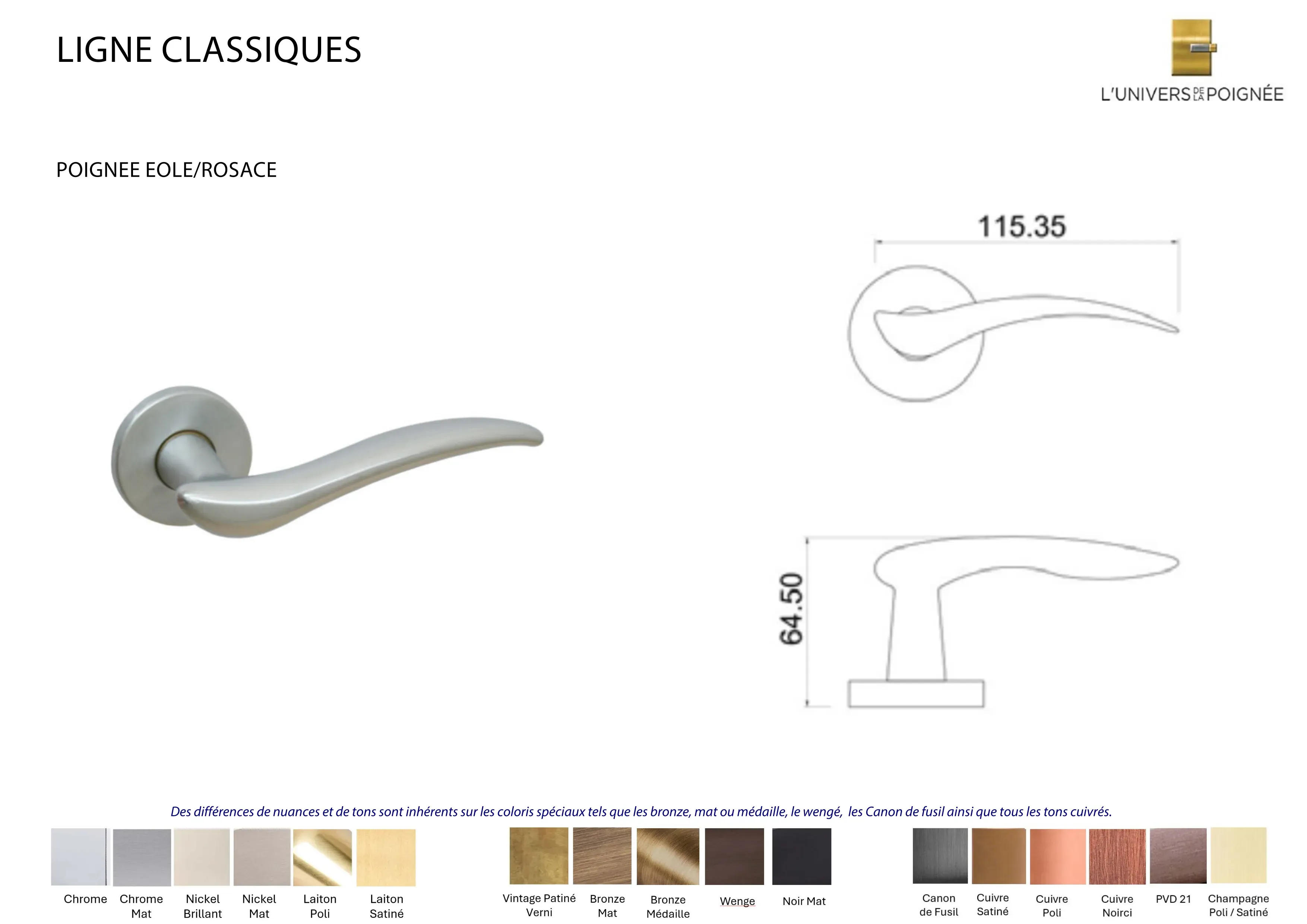 Des différences de nuances et de tons sont inhérents sur les coloris spéciaux tels que les bronze, mat ou médaille, le Wengé, les Canon de fusil ainsi que tous les tons cuivrés.