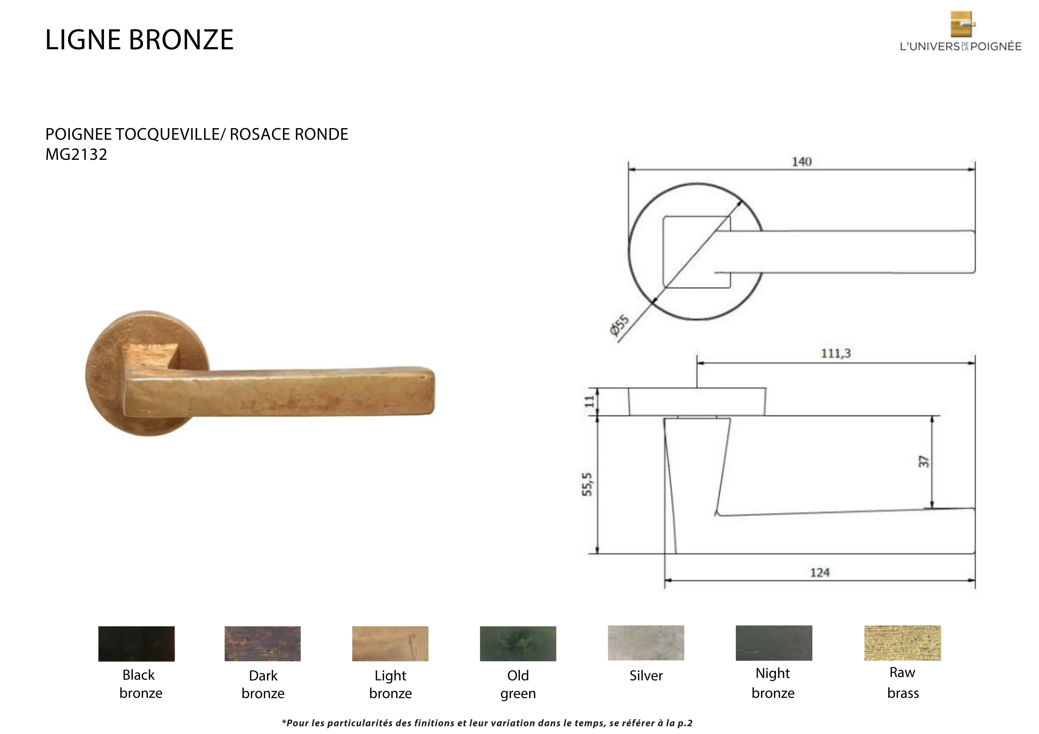 Parce que le bronze est un matériau vivant, la poignée Tocqueville est proposée avec des patines spécialement développées, qui lui permettent d’acquérir une patine naturelle au fil du temps et de s’embellir avec l’usage. Elle peut également être déclinée avec les finitions du laiton, bien que des variations naturelles puissent apparaître par rapport aux collections en laiton classique.