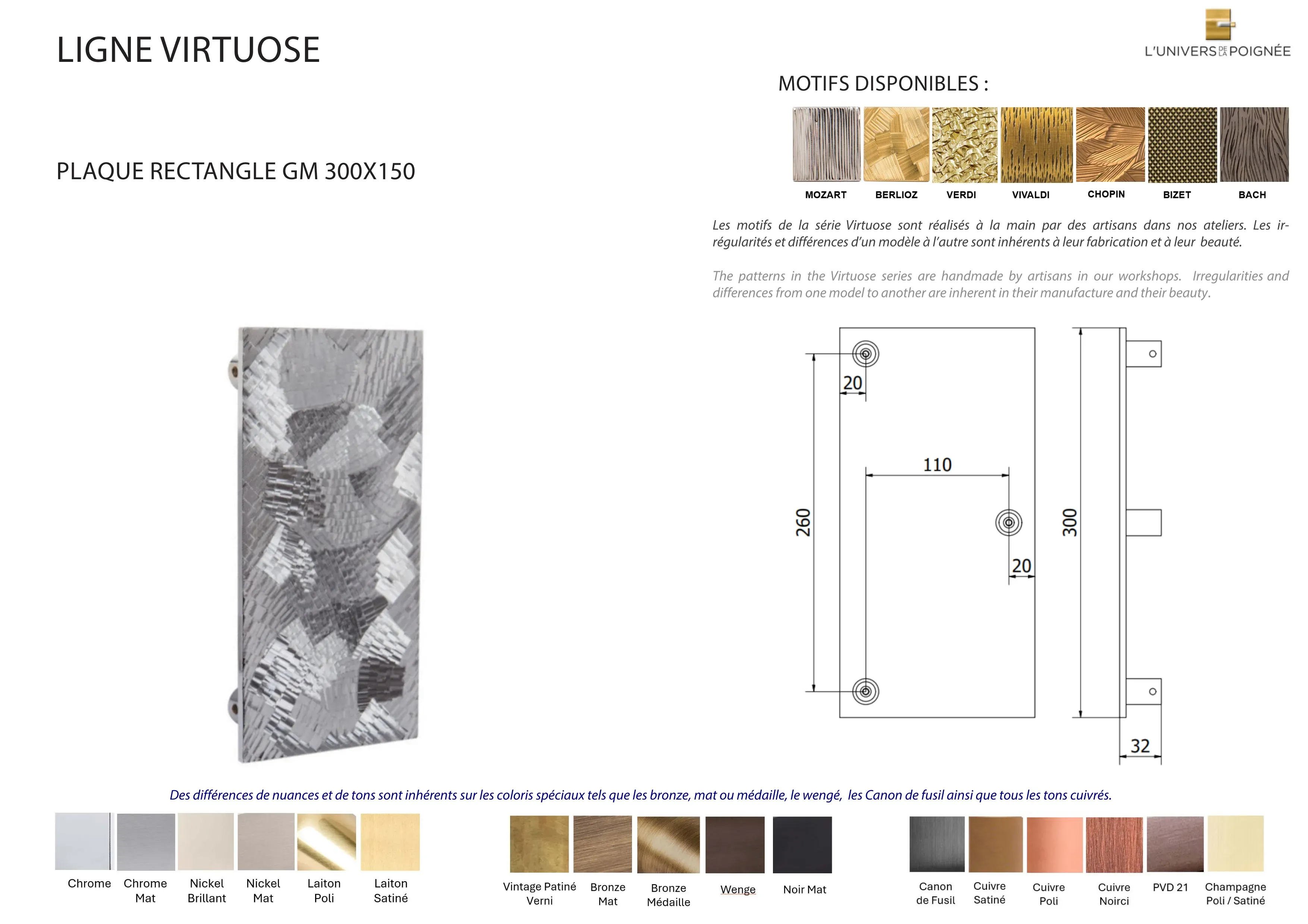 La plaque de tirage Virtuose 300X150mm est un modèle rectangulaire conçu pour allier praticité et esthétique. Son format sculptural met en valeur le travail des motifs gravés, réalisés à la main ou par machine, permettant une personnalisation variée selon les préférences et les finitions choisies.