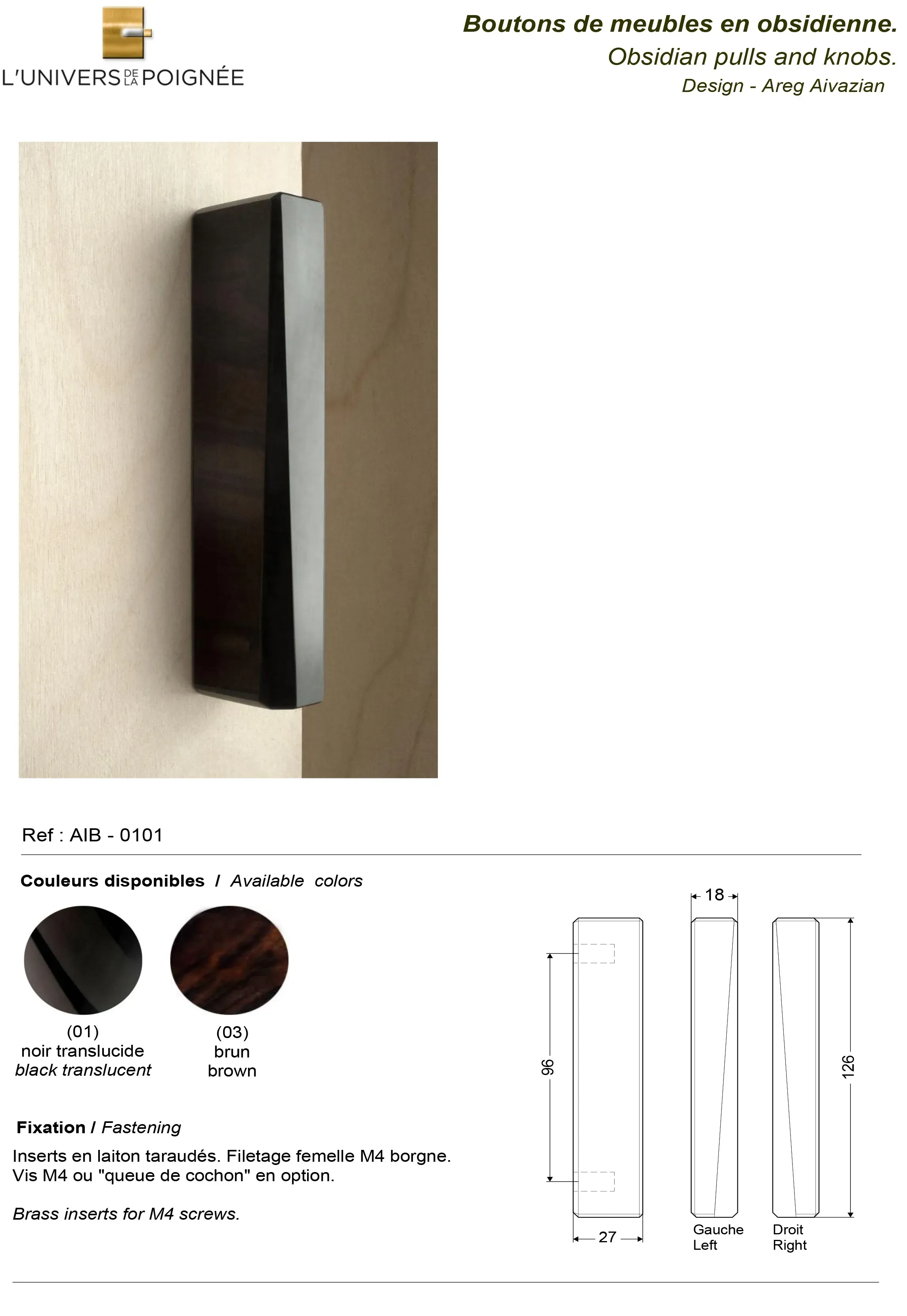 Disponibles en trois finitions selon les modèles – noir translucide, brun et acajou – ces poignées apportent une touche de caractère et d’élégance aux façades de placards et meubles. Leur surface lisse et brillante met en valeur la profondeur et les reflets naturels de la pierre, ajoutant une dimension sophistiquée et unique à chaque pièce.